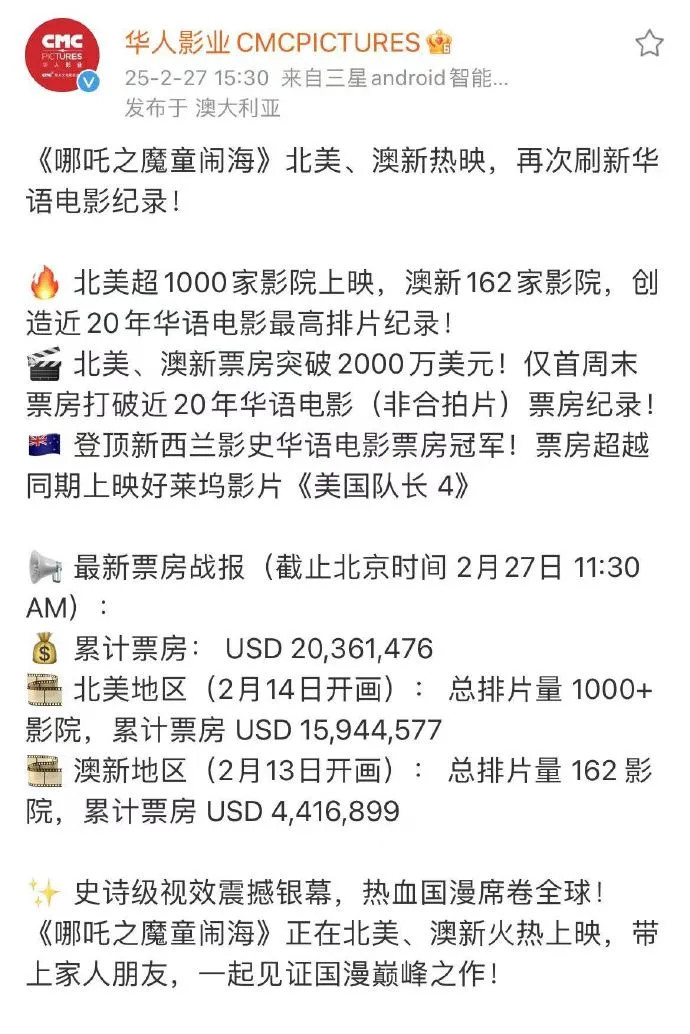 此前,@华人影业CMCPICTURES发出哪吒2北美、澳新新成绩,其中提到了《哪吒之魔童闹海》北美超1000家影院上映,澳新162家影院,创造近20年华语电影最高排片纪录。