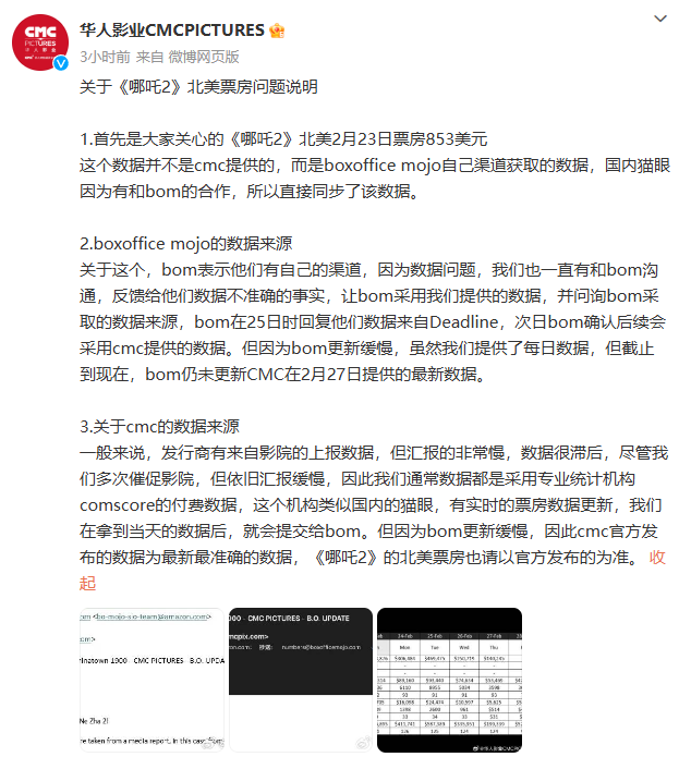 首先是大家关心的《哪吒2》北美2月23日票房853美元,这个数据并不是cmc提供的,而是boxofficemojo自己渠道获取的数据,国内猫眼因为有和bom的合作,所以直接同步了该数据。
